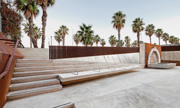整個工程只采用了兩種建材,斜坡、臺階和墻壁使用了混凝土,欄桿和覆蓋層則使用了柯爾頓鋼。廣場圍墻使用的是混凝土加木材。光線從兩點照射過來,強調(diào)了噴泉的價值和全新的空間。